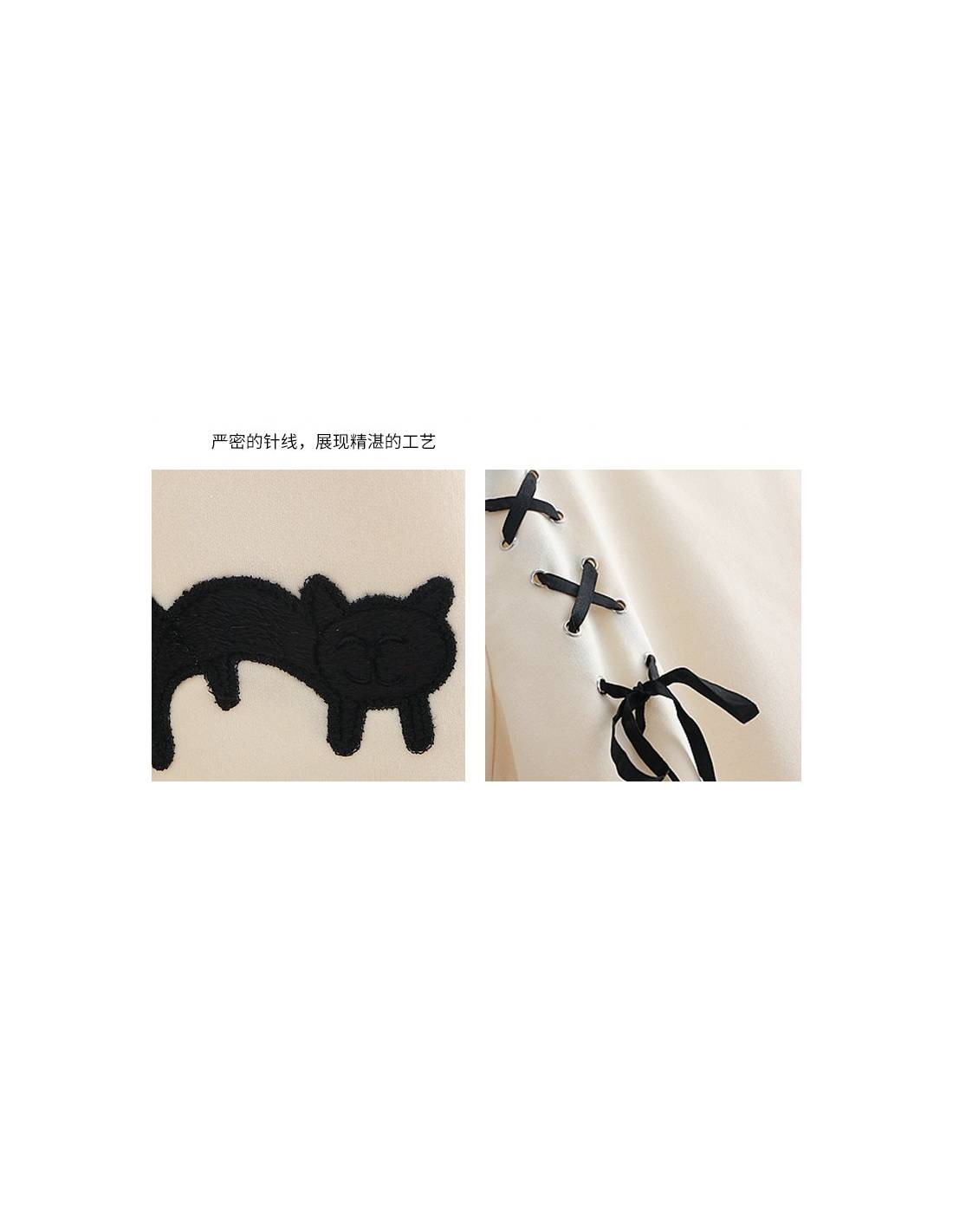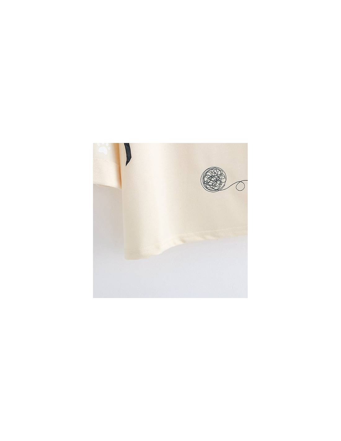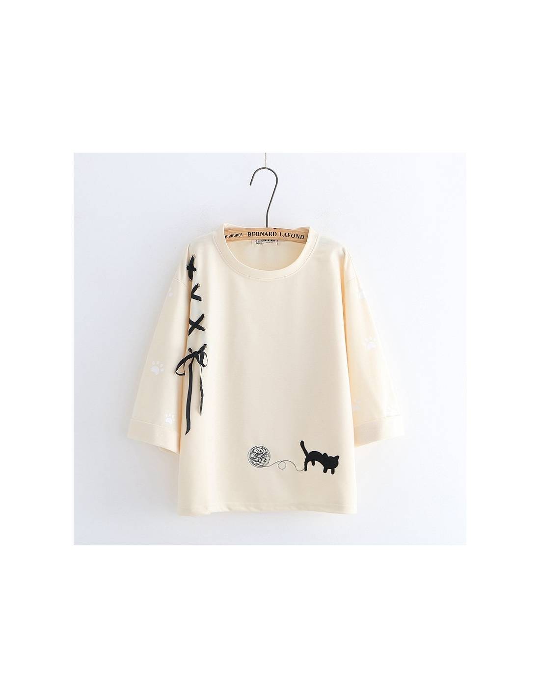 Conçu dans un style casual, il se distingue par son illustration adorable d'un petit chat noir jouant avec une pelote de laine, ajoutant une touche ludique à votre tenue quotidienne. Un ruban noir à lacer sur le côté apporte une touche de style et d’originalité supplémentaire, rendant ce haut parfait pour celles qui recherchent confort et style.