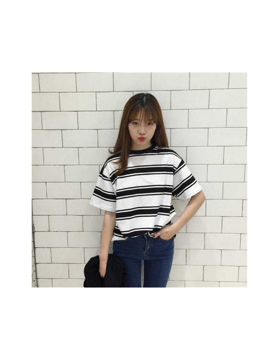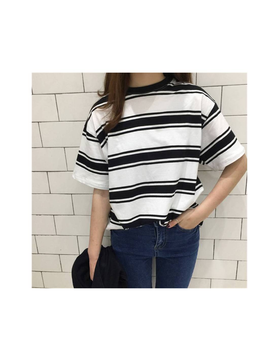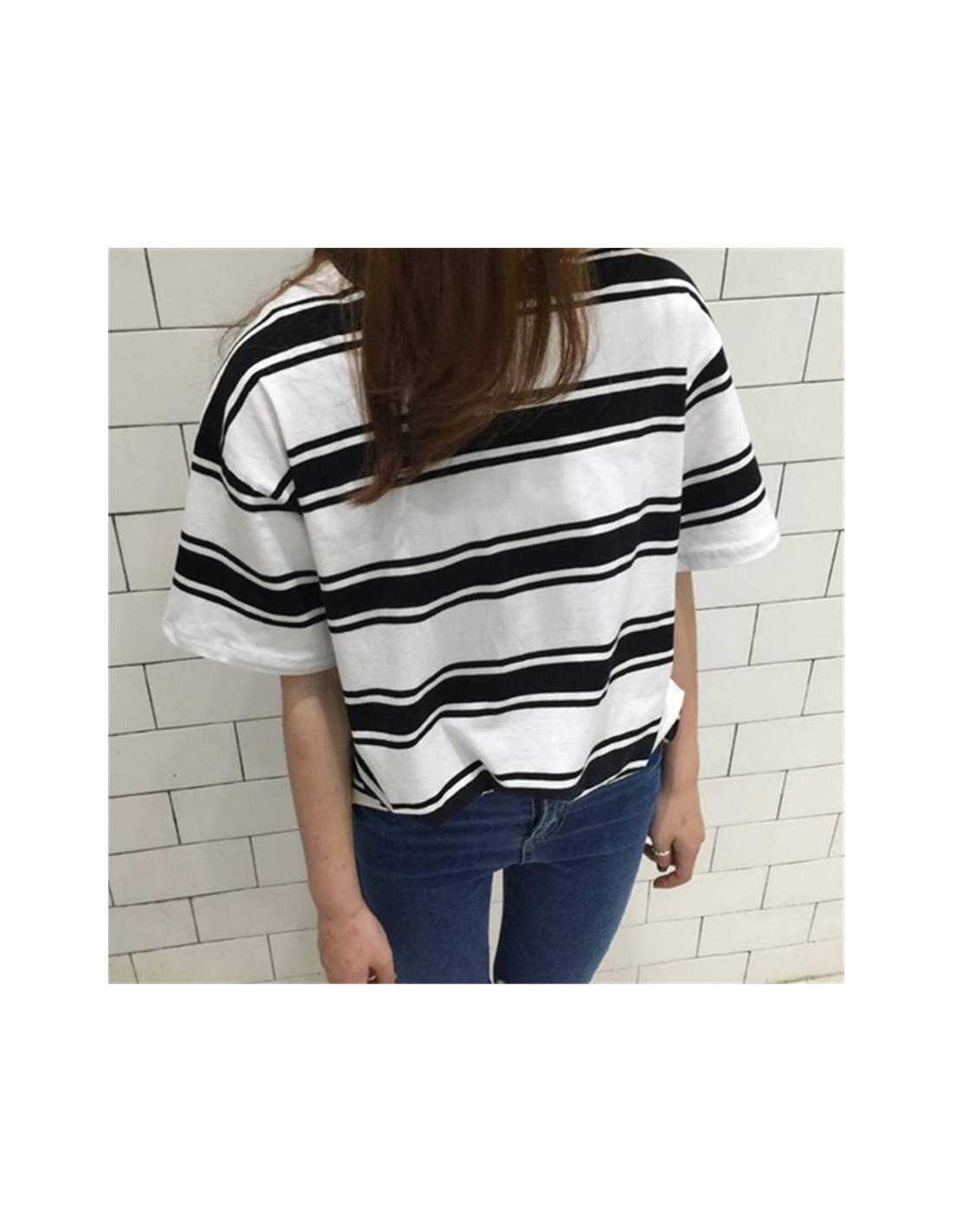 Ce t-shirt femme au style Harajuku, inspiré de la mode japonaise, se distingue par ses rayures modernes et son allure décontractée.