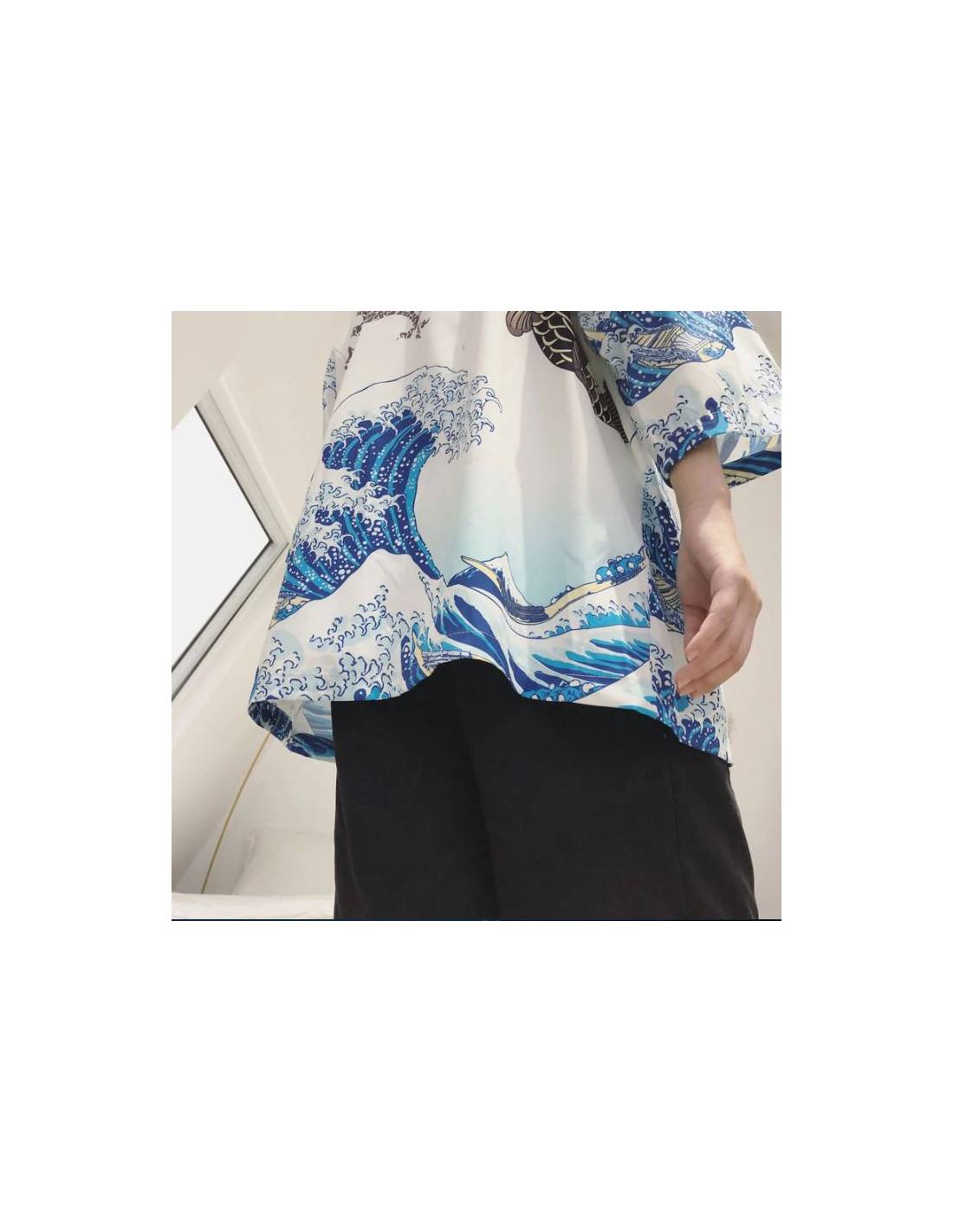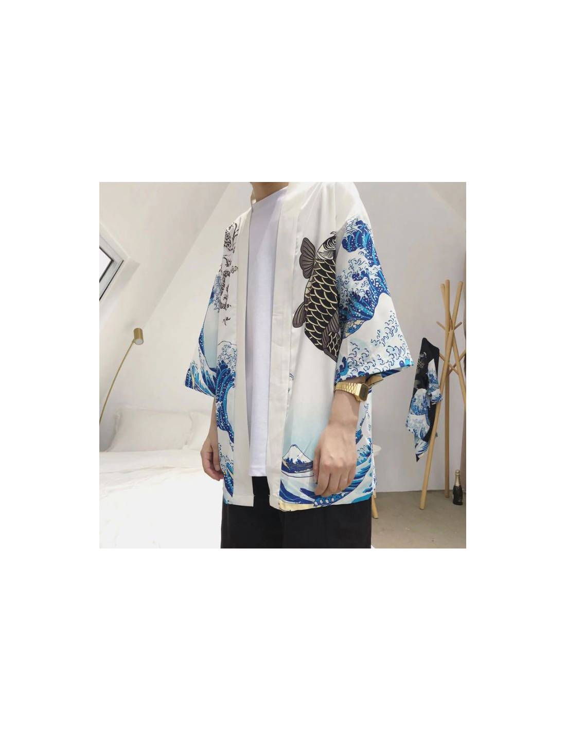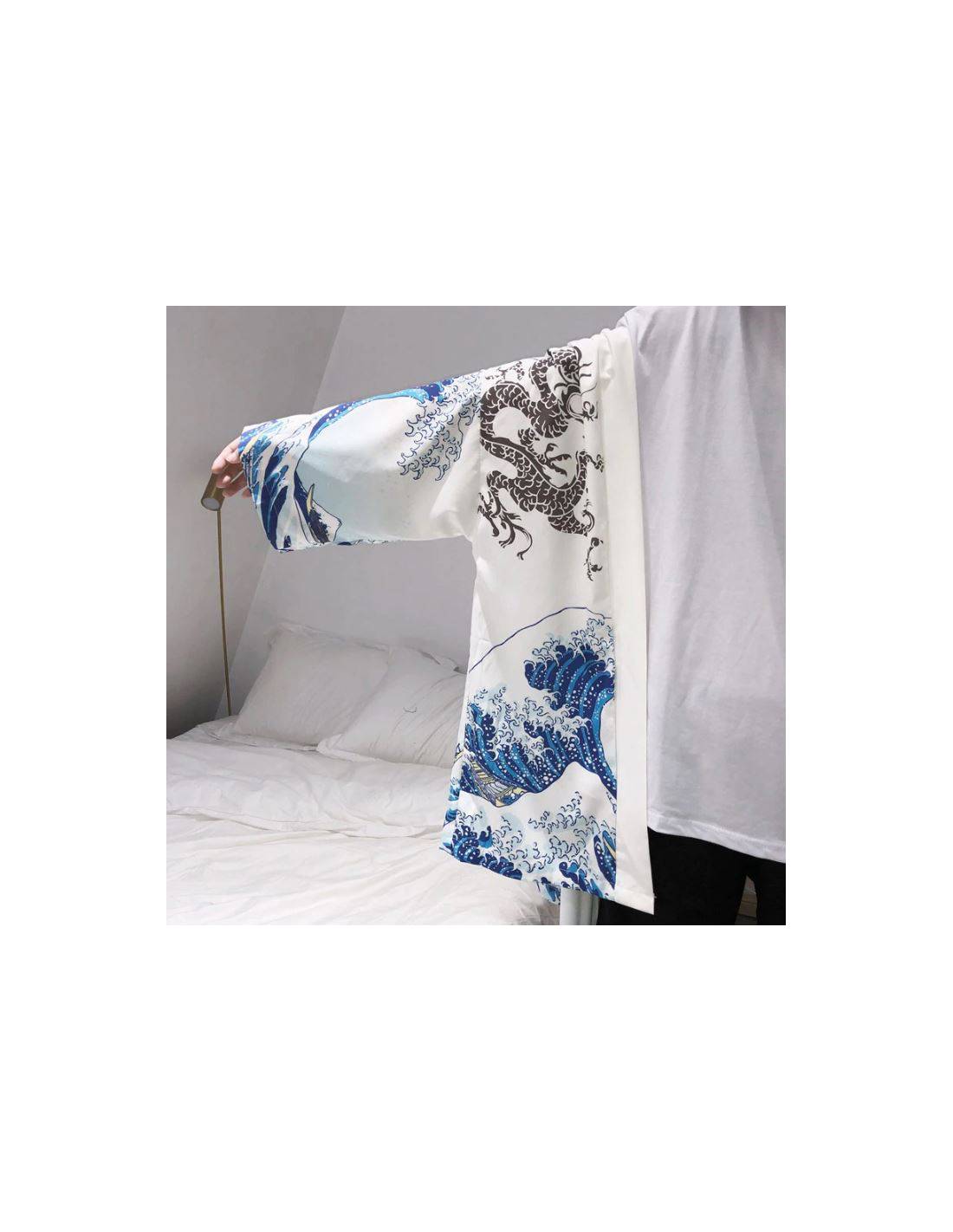 Plongez dans l'essence de la tradition japonaise avec ce magnifique kimono, disponible en deux couleurs élégantes : noir et blanc. Ce kimono se distingue par son design artistique inspiré des célèbres estampes japonaises, combinant des motifs de vagues déchaînées et une carpe koi, symboles de force, de persévérance et de transformation dans la culture japonaise.