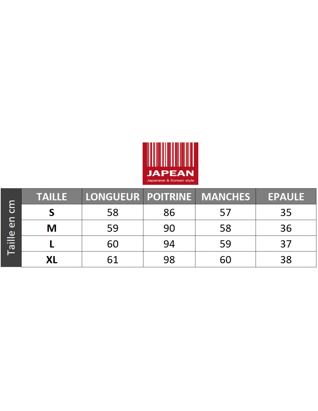 Conseil Japean : Prendre 1 taille au dessus de la votre (si vous faites du S prenez du M). Les mensurations sont indiquées dans la galerie d'images !