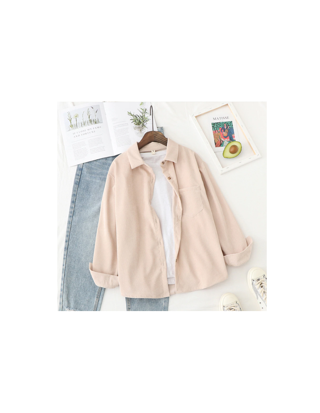 Chemise en velours beige clair. Manches longues fermeture boutonnée