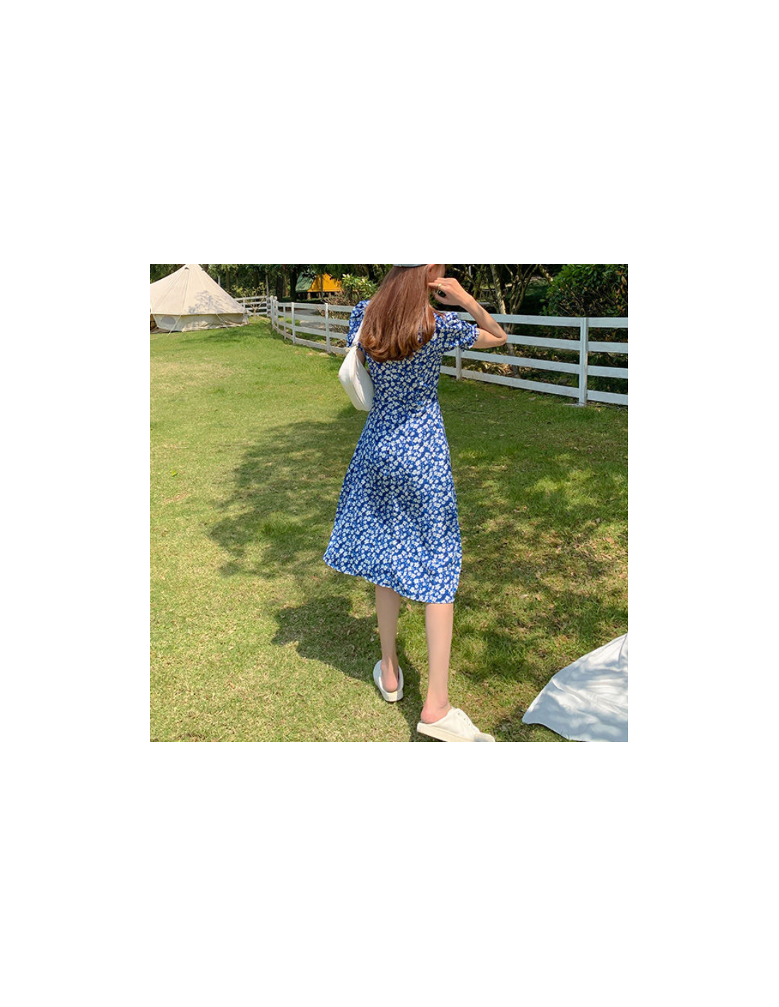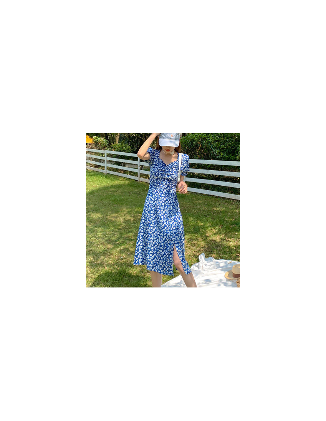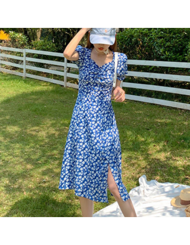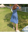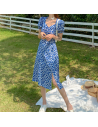 Robe mi longue fendu coloris bleu élégant avec imprimé fleurs
