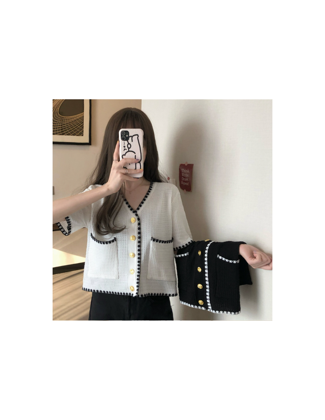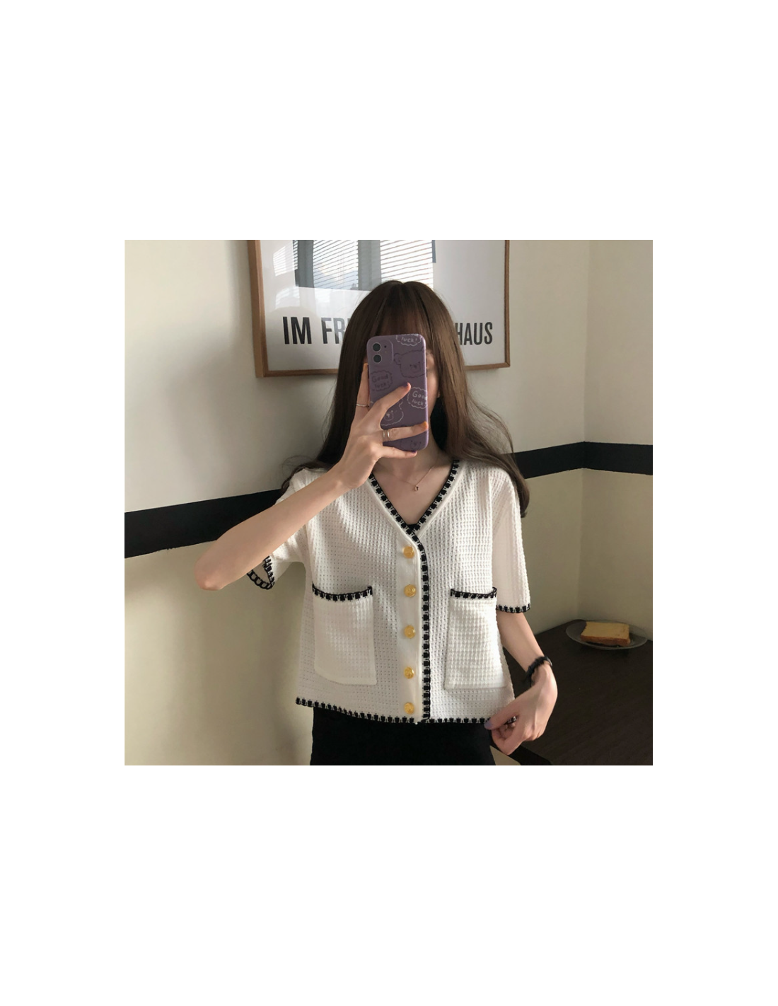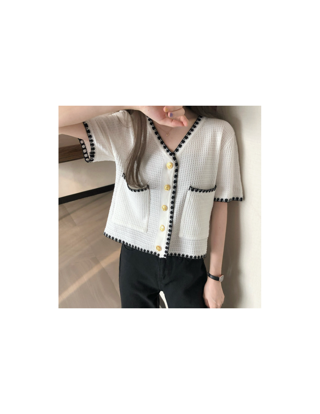 Top élégant au style vintage avec une encolure en V, deux poches et boutons sur la fermeture