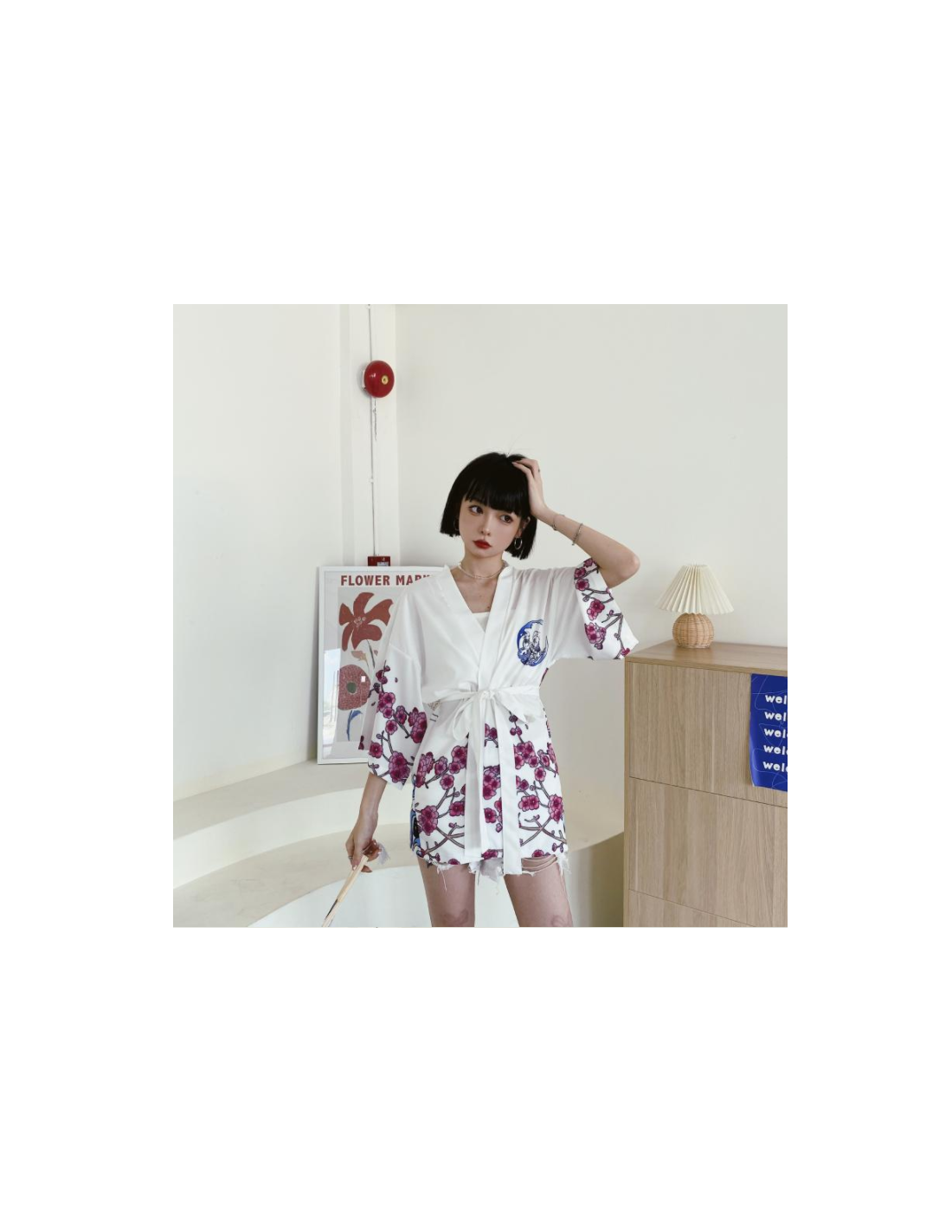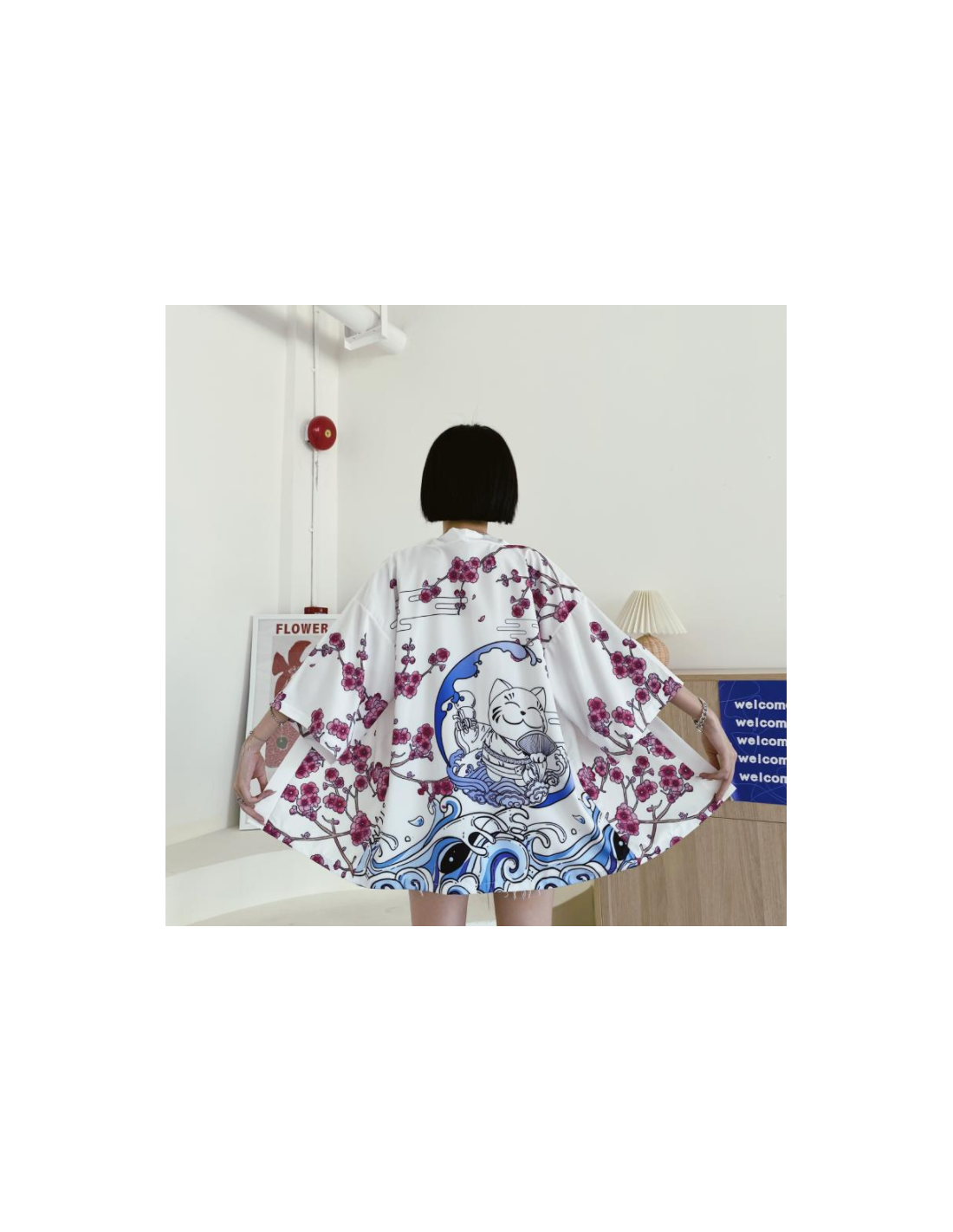 On choisit ce Kimono Yukata Cherītsurī quand on veut une surcouche facile à enfiler, mais vraiment marquée : un motif fleurs, une couleur au choix (noir ou blanc), et un grand visuel au dos visible sur les images (en noir : chat + vagues bleues). Il est en matière polyester et renvoie aux mensurations en galerie (taille unique). Bref, une pièce qui “fait tenue” en un geste (clin d’œil sobre).
