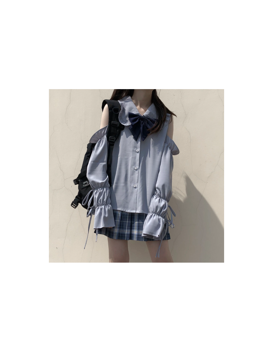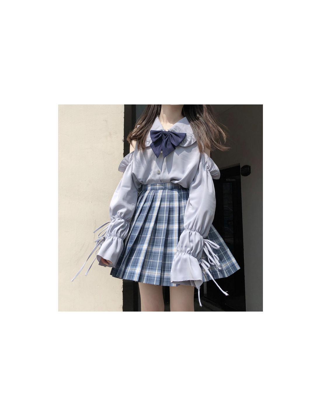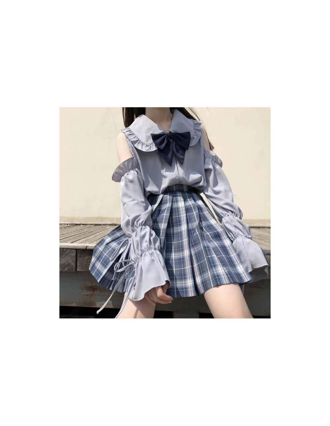 Avec sa teinte bleu pâle, ses épaules dénudées, ses manches bouffantes resserrées aux poignets et son col à volants, elle crée une silhouette romantique inspirée des tendances japonaises.