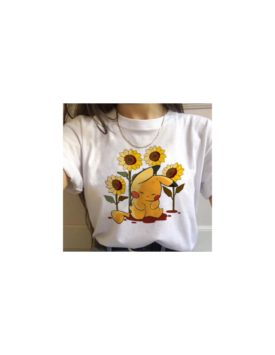 T-shirt blanc à l'effigie du célèbre pokémon Pikachu dormant sous des fleurs de tournesols, trop mignon !