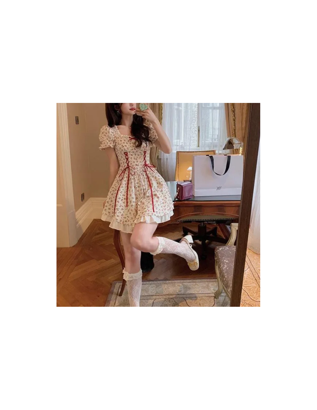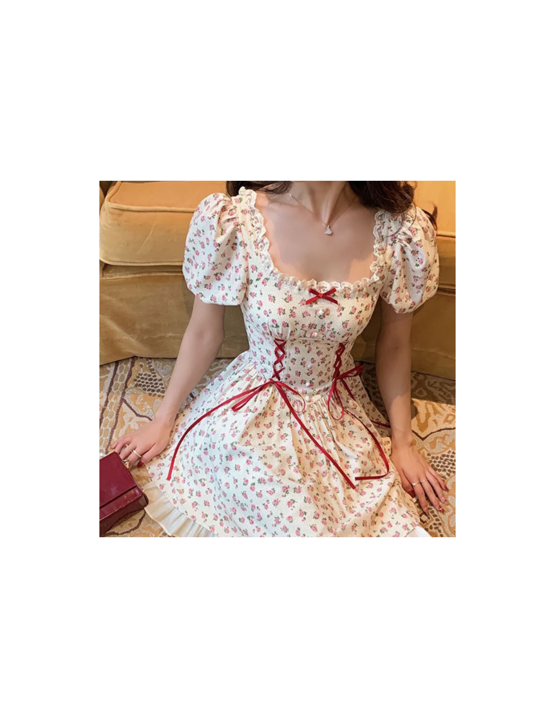 Les manches bouffantes apportent une touche de romantisme et de délicatesse, tandis que le col carré met en valeur le décolleté avec subtilité. Le motif de fleurs roses dispersées sur le tissu blanc donne une impression de fraîcheur et de douceur, renforçant l'esthétique romantique de cette pièce.