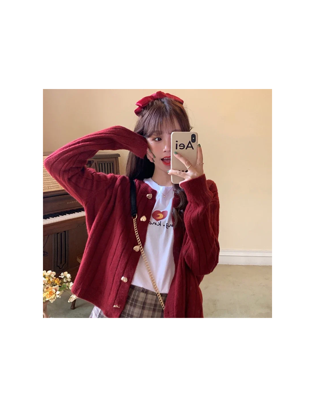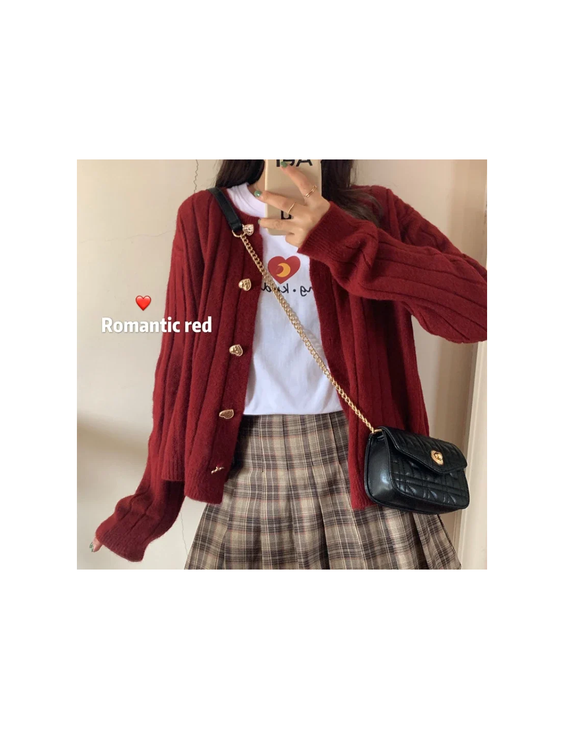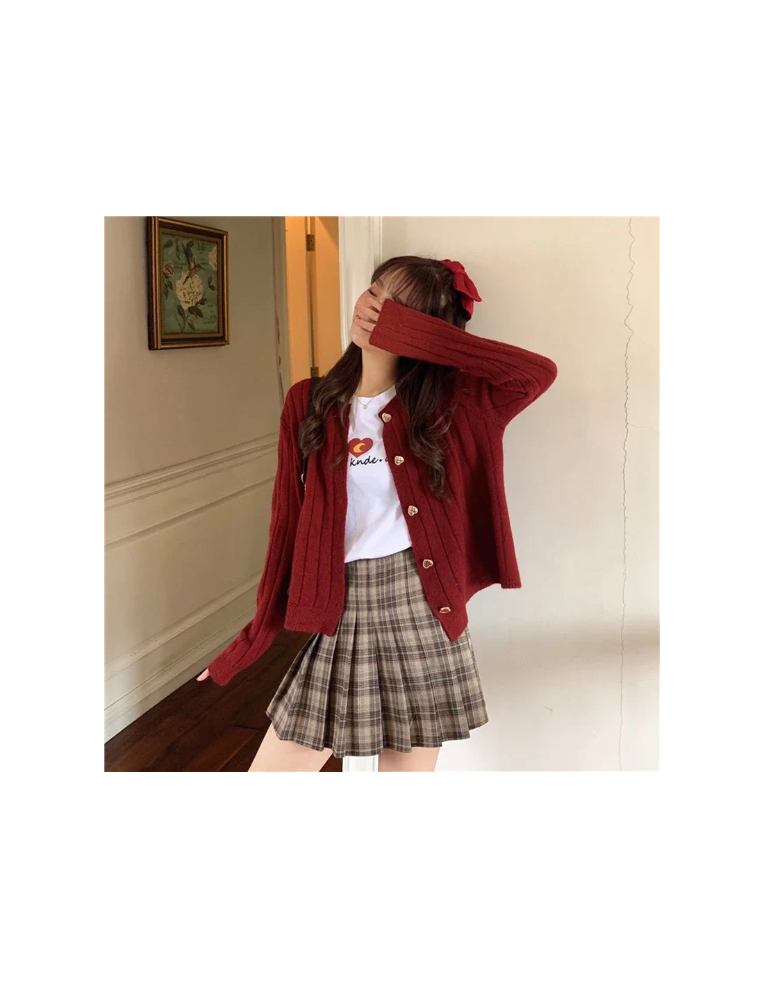 - cardigan fermé + jupe à carreaux + chaussures sobres : les boutons cœur deviennent le centre du look