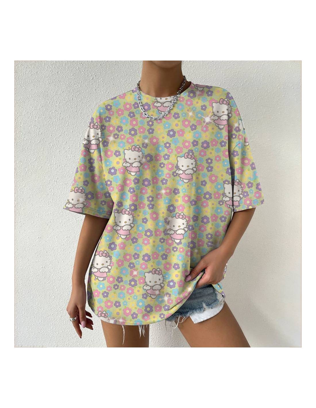 Adoptez un style kawaii et décontracté avec ce t-shirt oversize pour femme ! Son imprimé pastel mêle un adorable motif inspiré de Hello Kitty accompagné de petites fleurs multicolores sur fond jaune doux. Conçu dans une coupe ample et confortable, il est parfait pour un look streetwear, casual ou cocooning. Associez-le facilement avec un short en jean ou un pantalon décontracté pour une touche girly et tendance.