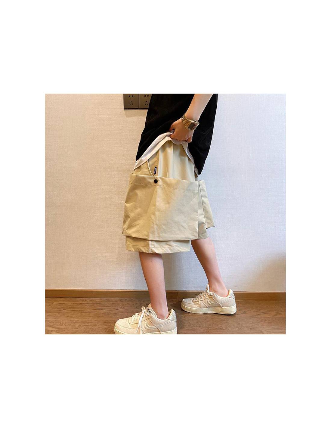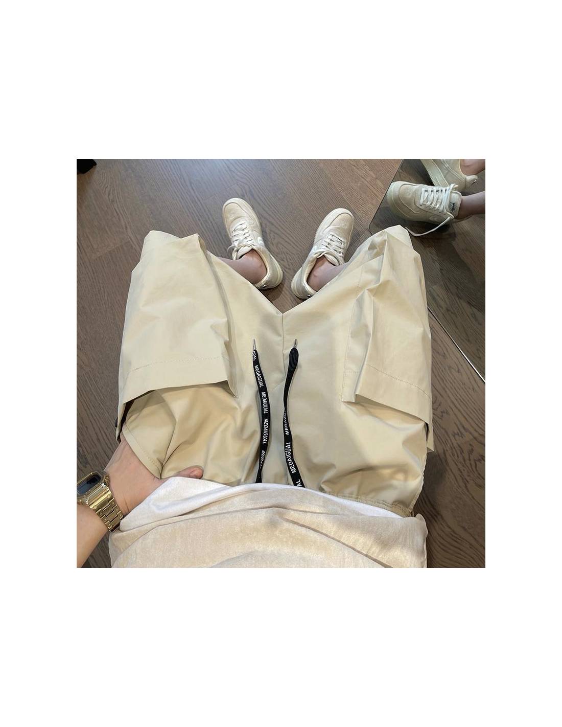 Conçu dans un tissu beige premium, il est doté de larges poches plaquées latérales et de cordons ajustables. Son design minimaliste mais fonctionnel est inspiré des tendances Tokyoïtes, parfait pour un look urbain, confortable et moderne. Portez-le avec un t-shirt oversize et des sneakers pour un outfit 100% citywear.