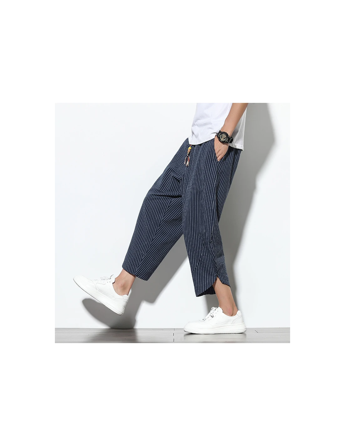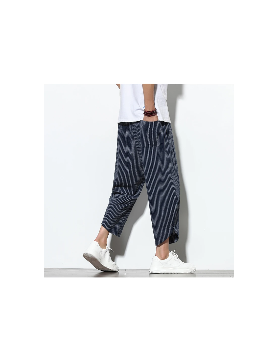 Inspiré du hakama traditionnel, ce pantalon ample et fluide allie confort moderne et esthétique nipponne. Sa coupe cropped, ses rayures fines et son cordon orné de perles apportent un look casual-chic unique. Parfait pour l'été, il se porte aussi bien en ville qu'à la maison. Associez-le avec un t-shirt oversize et des baskets blanches pour un look streetwear zen.