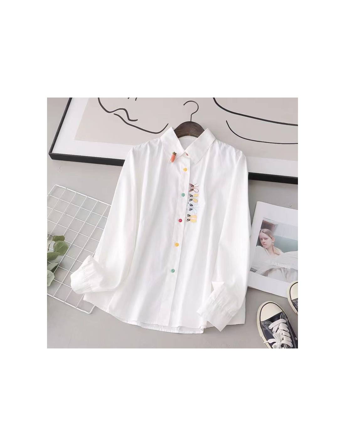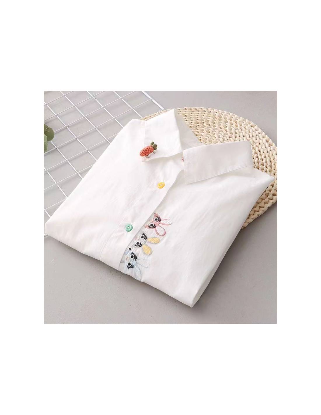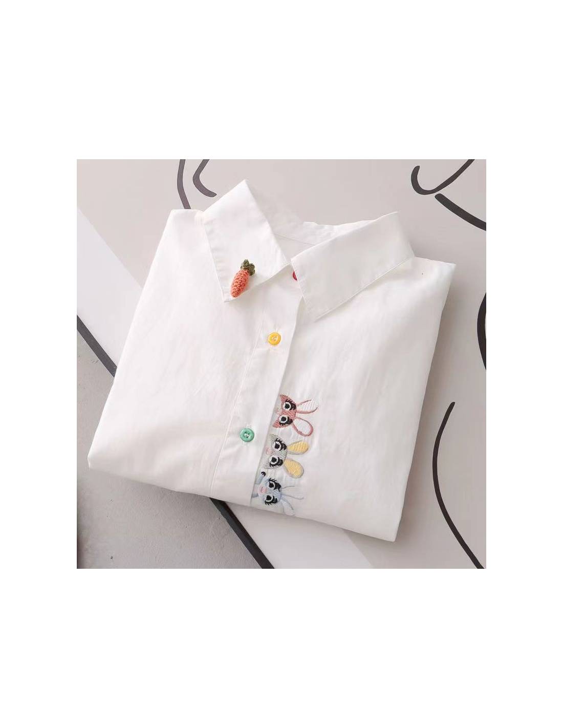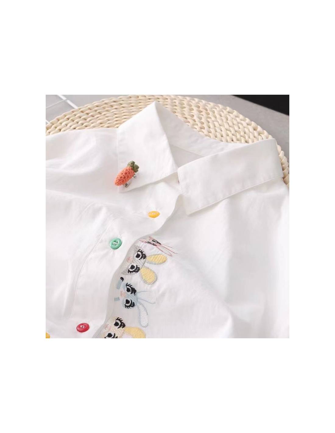 La Chemise Usagi Parade garde une silhouette décrite droite et fluide, facile à porter au quotidien, puis vient casser la sobriété avec une parade de petits lapins brodés le long de la boutonnière. Les boutons multicolores ajoutent une touche ludique, mais l’ensemble reste cadré : c’est du kawaii maîtrisé, pas une chemise “costume”. Et le détail signature, annoncé noir sur blanc : une petite carotte en relief fixée sur le col, façon broche, qui donne tout de suite le ton (clin d’œil discret : la chemise blanche qui lance la conversation sans hausser la voix).