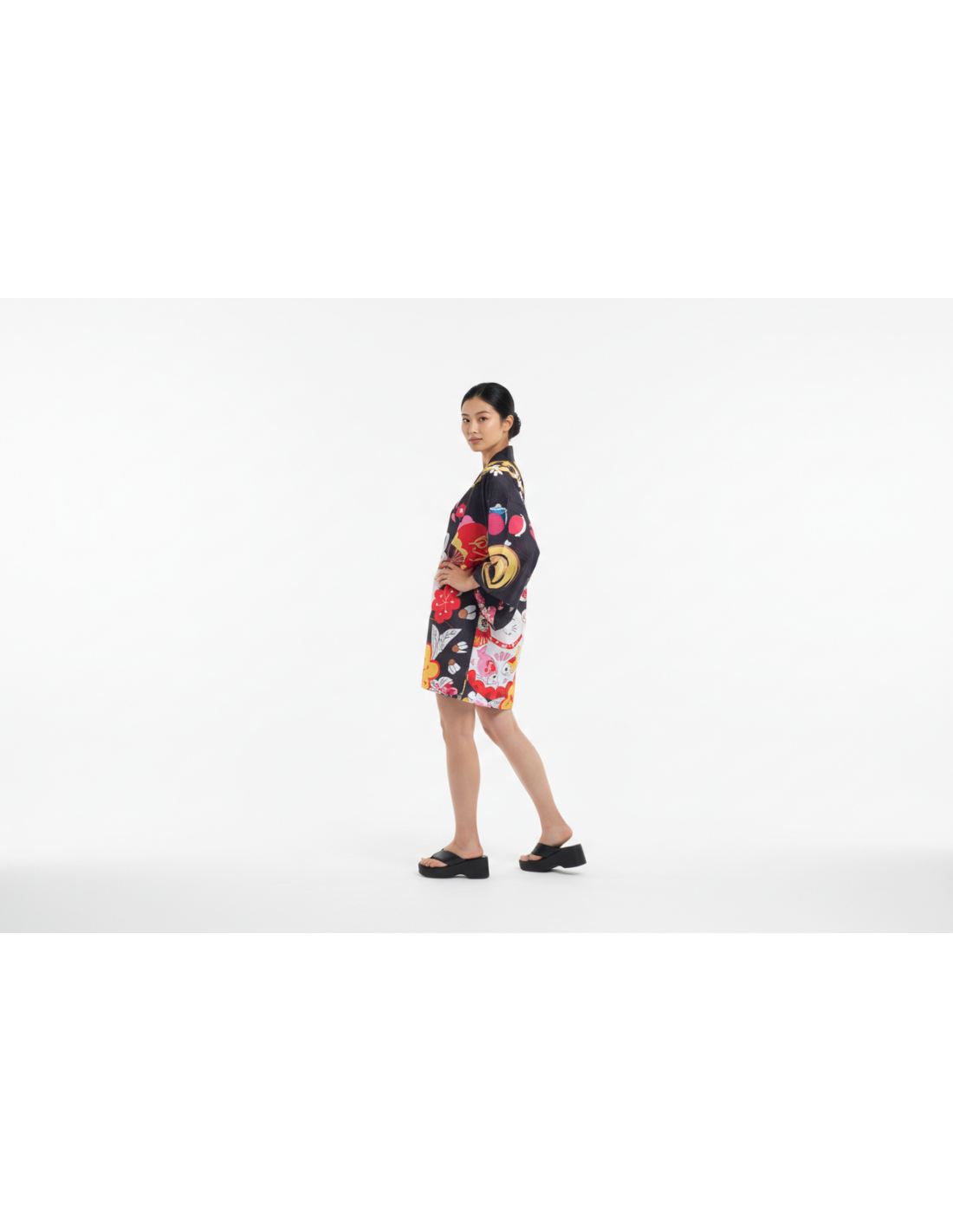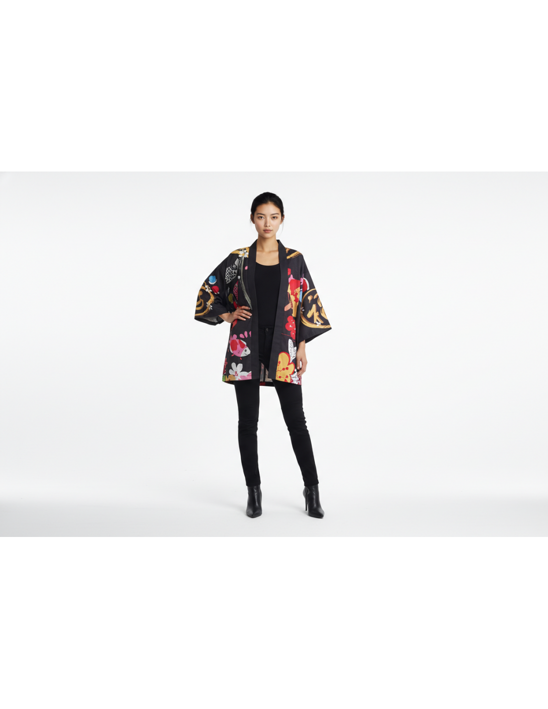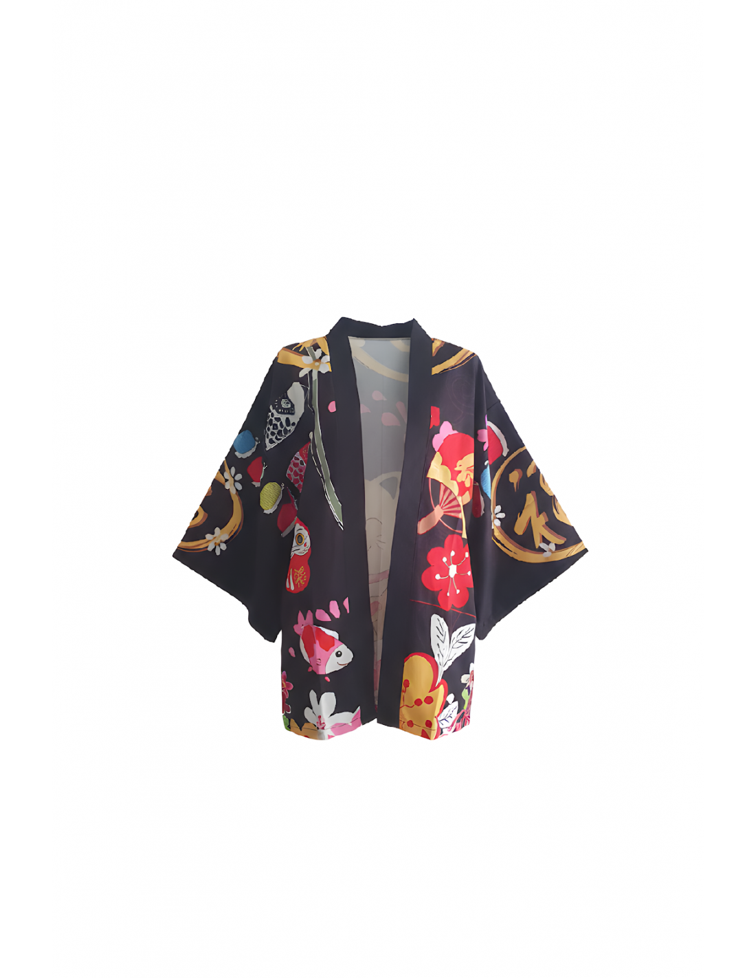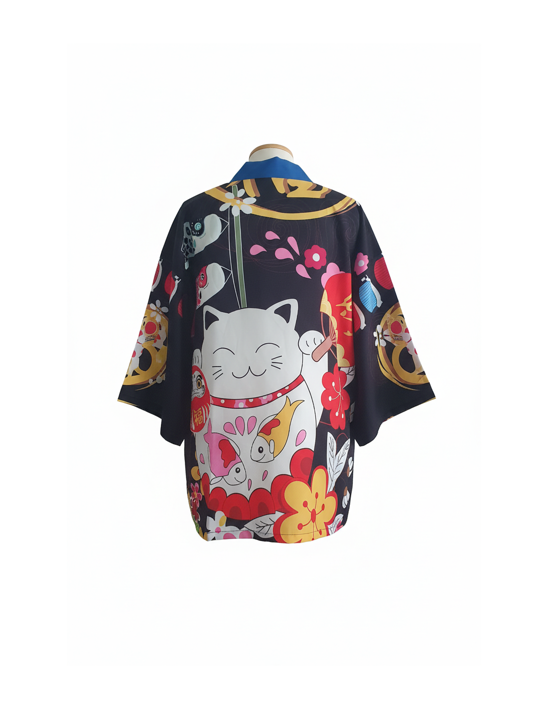Le Kimono noir Maneki-neko fleuri mélange l'univers japonais, un imprimé riche en détails et une silhouette facile à superposer. Le fond noir met en valeur le Maneki-neko, les fleurs et les motifs colorés, pour un rendu visuel fort sans perdre la lisibilité du modèle.